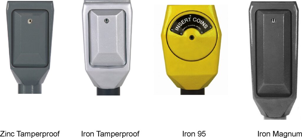 Every style features a rear-mounted lock, tapered base to discourage forced removal, and durable powder paint finish in gray or black with other colors available (simply provide Pantone or PMS color number). Options include standard, security, and changeable locks with or without SmartLock integration with the mechanism; standard open-top inner coin cup or security sealed coin box; and standard or Gripper wedge post mounting hardware.